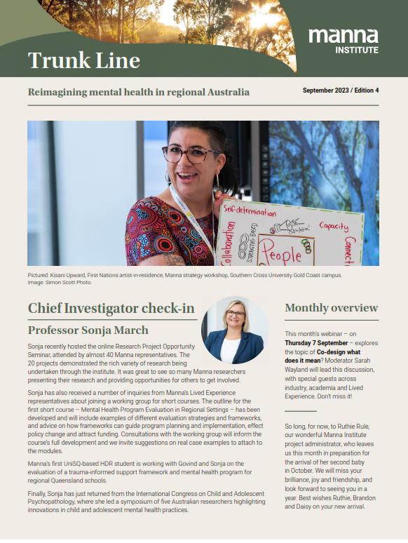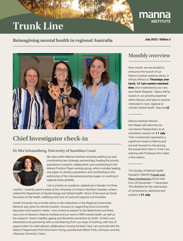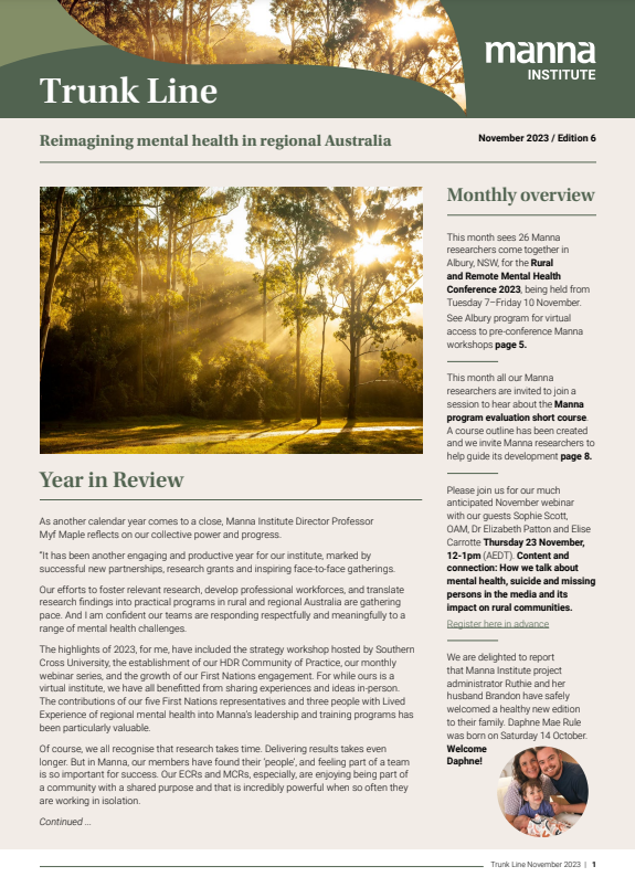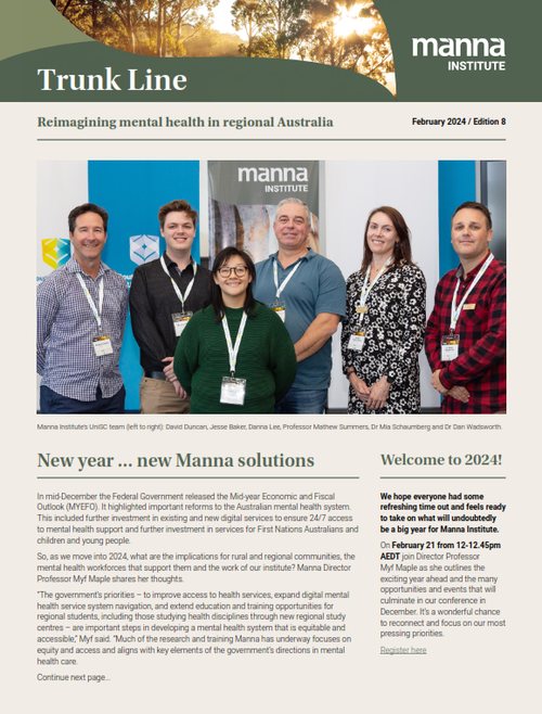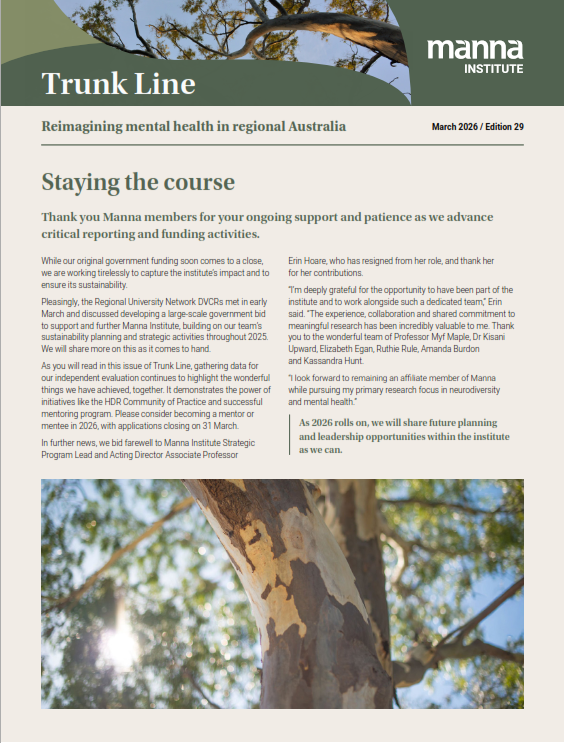 Trunk Line is Manna Institute's monthly newsletter, connecting you to the heart of rural and regional mental health research in Australia. Each edition shares stories of our researchers, students and community partners who are reimagining mental health care across regional Australia – from ground-breaking research and innovative programs to the people making it happen. Subscribe today and join our growing network committed to improving mental health and wellbeing in rural, regional and remote communities.